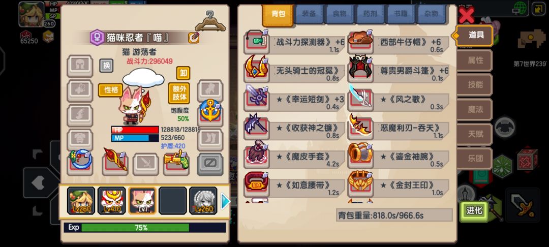 装备是这样的,新搞了一只1级的猫准备玩奇怪的套路,目前还没练技能,先拿来测试用