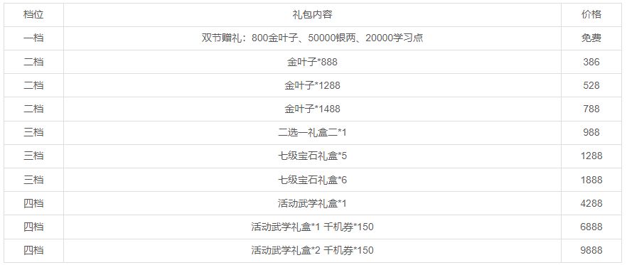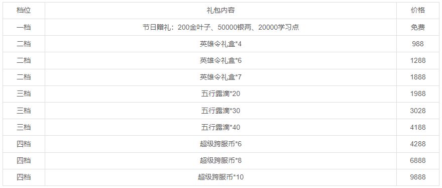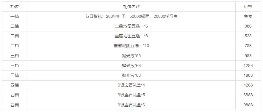 活动一:活动期间将限时上架节日礼包,礼包内容如下: