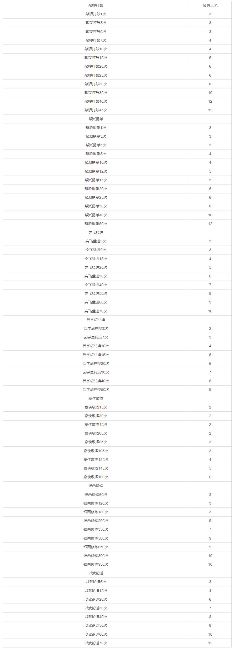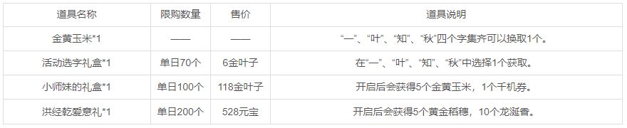 活动期间,通过“江湖磨砺”挂机,在挂机次数内必定掉落“一”、“叶”、“知”、“秋”集字道具中其中1个,集齐四个字可兑换道具“金黄玉米”,收集“金黄玉米”可以兑换各式好礼。