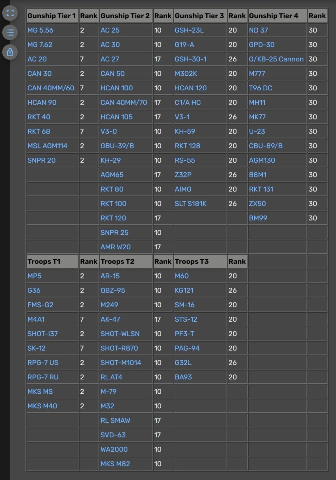 武器等级表,gunship代表机载,troop代表部队,rank代表初始等级,每一级武器只会出现在同级或更高的箱子内。谁来把我T4箱子里的MP5请出去?图表拍摄时间为2023年9月18日15:48,在此时间后更新的任何武器基本可以认为是T4级: