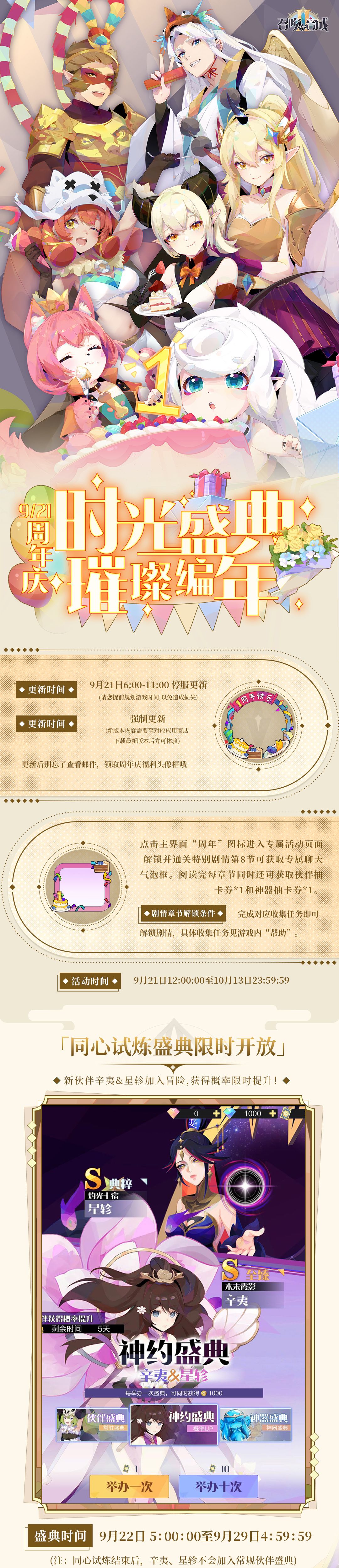 各位好,距离周年庆还有3天,召合2将于9月21日06:00-11:00进行停服更新,期间将无法登录游戏。请您提前规划游戏时间,以免造成损失。