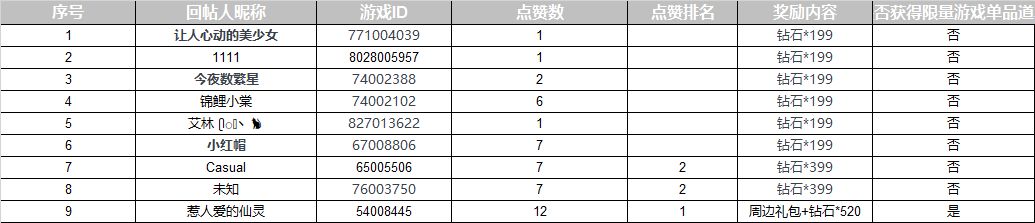 本次活动中奖玩家如下,另外由于点赞2-3名共有3人,按照规则,先参与活动前两名获得奖励