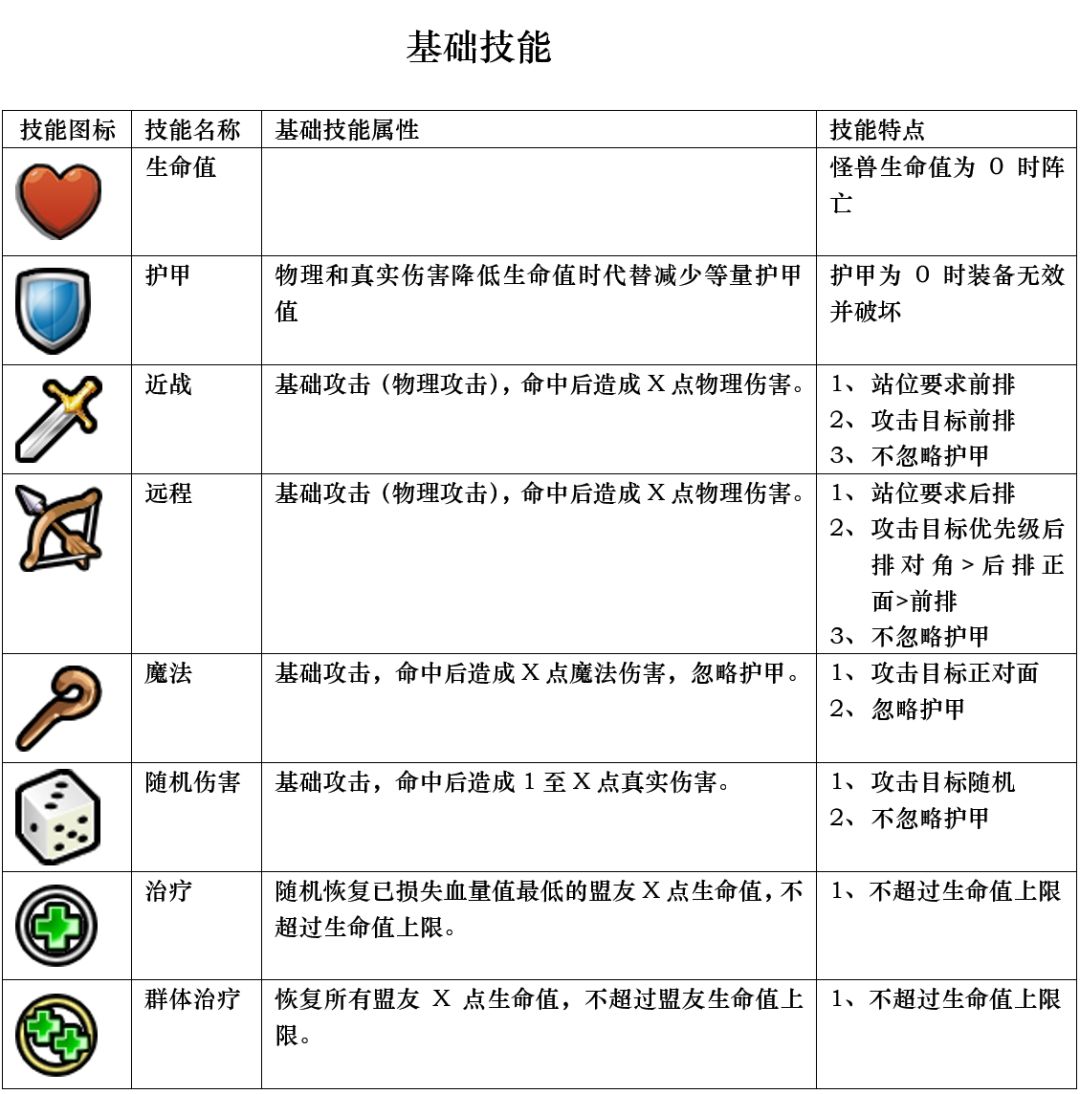 - 基础技能:生命值、护甲、基础攻击、治疗、群体治疗(位于卡牌面板两侧)。其他的技能均为非基础技能(位于卡牌面板中间)。一般情况下,每只怪兽可以有3个技能位置,精英卡和部分觉醒卡可以拥有4个技能位置。