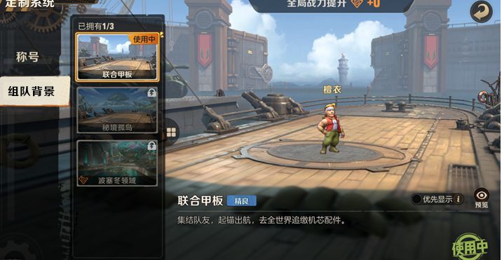 首先是大家默认拥有的精良品质-联合甲板,在这里集结队友,起锚出航,去全世界追缴机芯配件!即使还未拥有属于自己的组队背景,也可以进入定制系统中进行预览。同时,在定制系统中点击优先显示,就能在进入联合行动后优先展示你使用中的组队背景。即使你不是房主也能看到自己心爱的装扮哦~