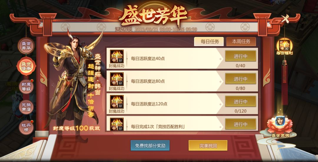 盛世任务分为每日任务和本周任务,完成任务可获取封魔经验。错过每日任务可通过找回领取奖励。本周任务每周—零点刷新~