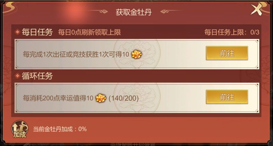 活动期间完成出征、竞技任务或累计消耗幸运值可获得金牡丹。封魔等级对金牡丹的获取有加成。