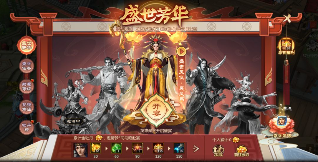 积累一定数量的金牡丹后可领取对应奖励,邀请完上一位英雄后就可解锁下一位。