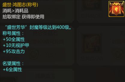 当大家封魔等级达到400级时,可以获得称号盛世·鸿图志(称号)。