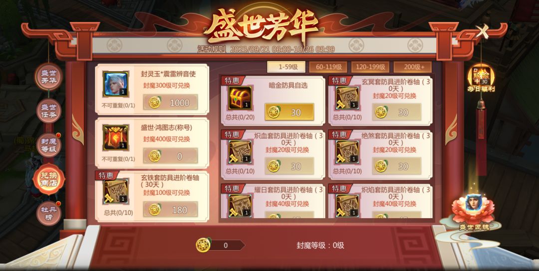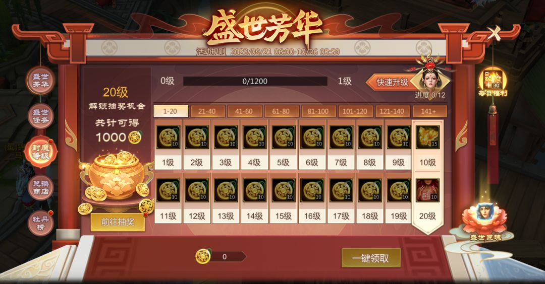 本次活动主要分为了五大部分:盛世芳华、盛世任务、封魔等级、兑换商店、牡丹榜。