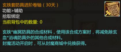 封魔等级达到100级时,180宝相玉可以兑换玄铁套防具进阶卷轴(30天)。