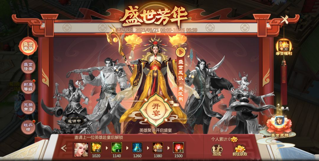 累计金牡丹邀请四位英雄赴宴,集齐全部人后方可开宴领奖。