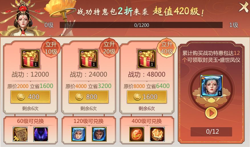 除了上面的盛世匠魂礼包之外,大家还可以购买战功特惠包提升封魔等级,累计购买战功特惠包数量达12个可领取封灵玉*盛世凤仪。