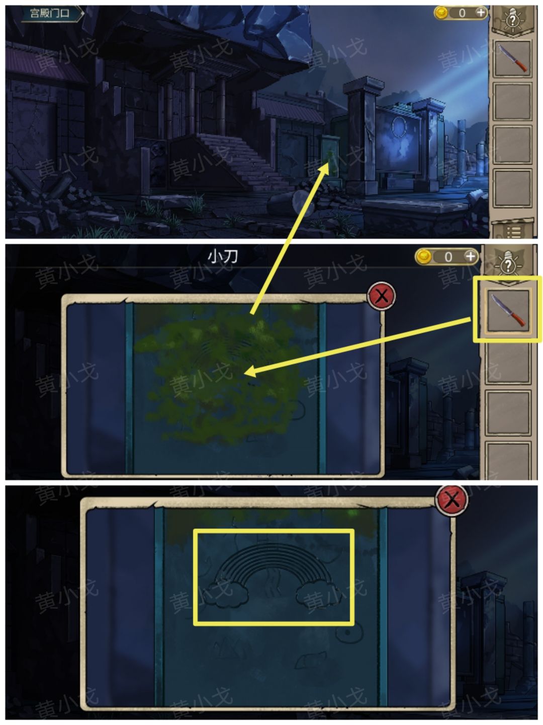 13.(宫殿门口)点击被青苔覆盖的石碑,用【小刀】刮掉上面的青苔,获得图案线索(彩虹)