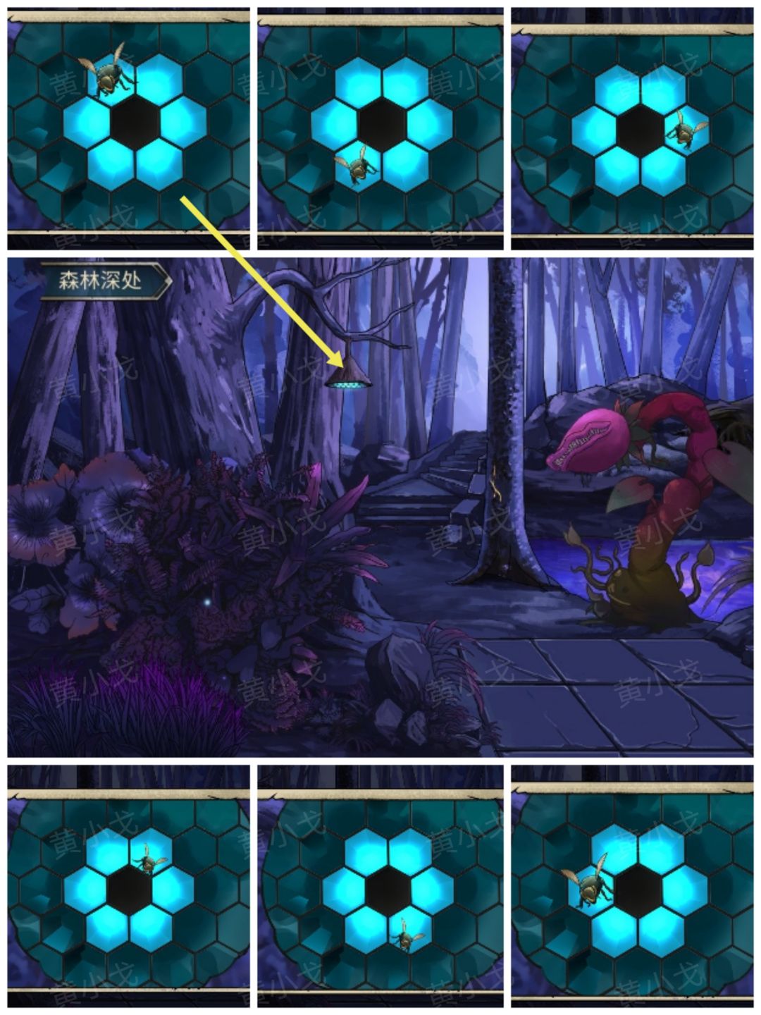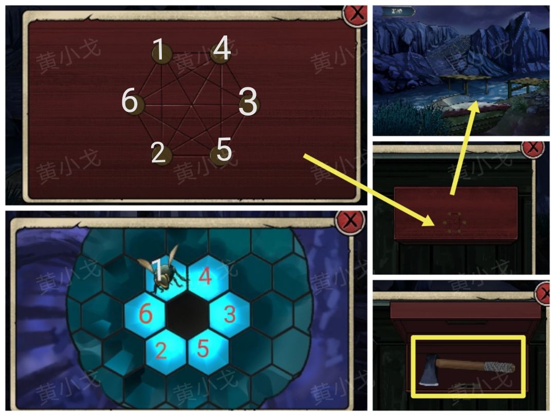 1.(森林深处)点击蜂窝,注意看蜜蜂飞出来的顺序