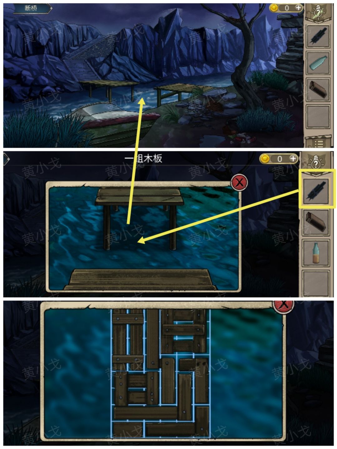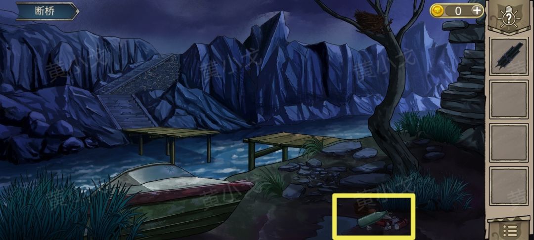 12.(断桥)点击断桥,铺上【一组木板】,完成小游戏,去到宫殿