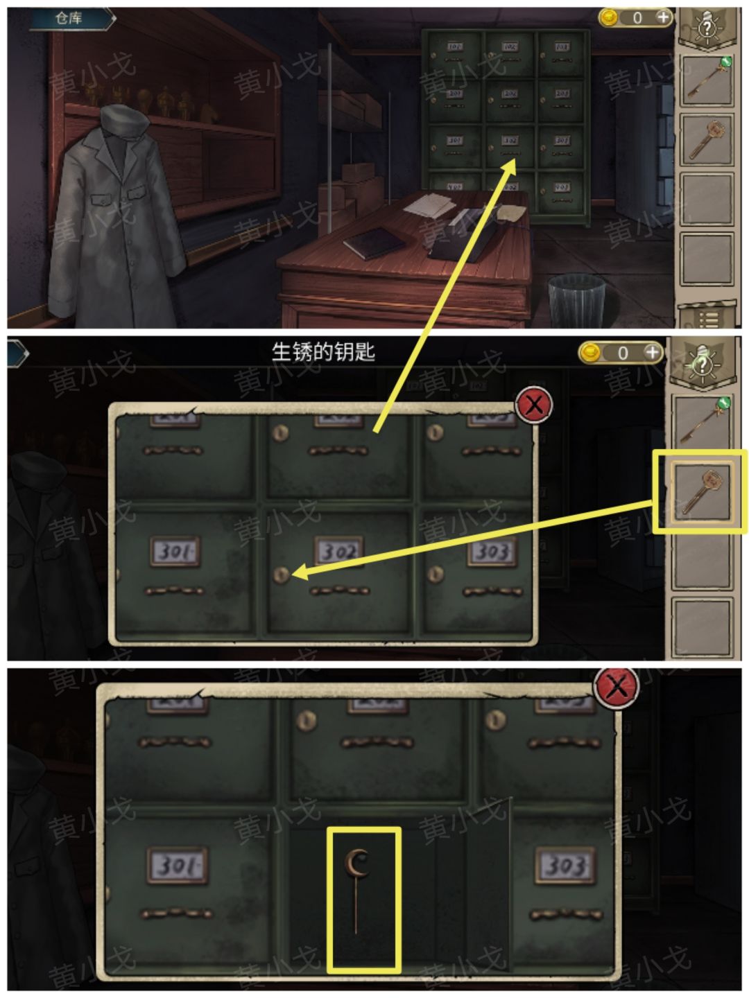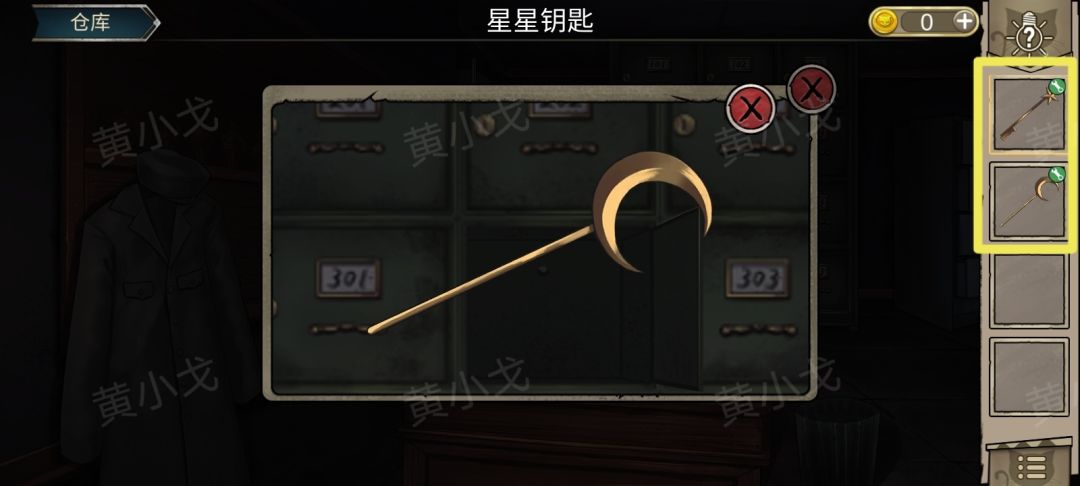 29.点击绿色302柜子,用【生锈的钥匙】打开(钥匙上有编号302),获得【月亮钥匙】