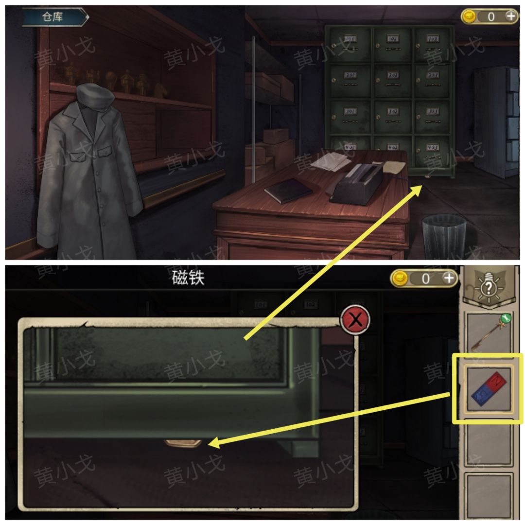 28.(仓库)点击绿色柜子底部,用【磁铁】吸【生锈的钥匙】