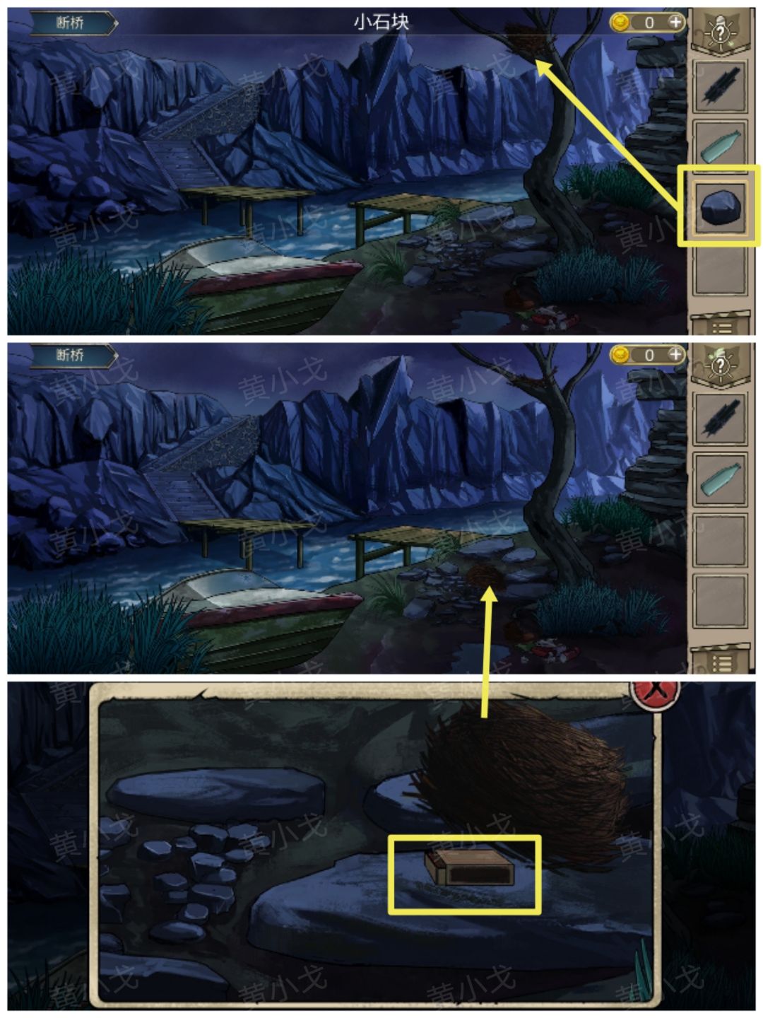 4.用【小石块】砸树上的鸟窝,鸟窝掉下来,获得【火柴盒】