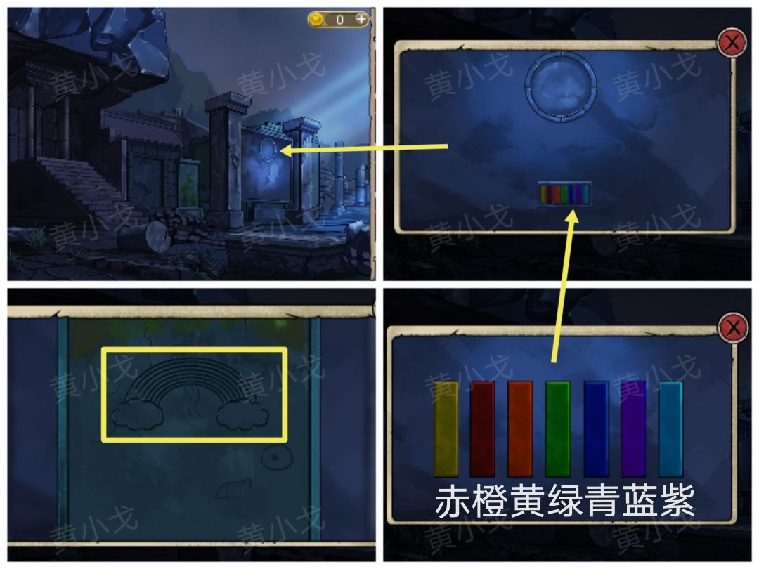 14.点击石壁,根据彩虹图案,按下(赤橙黄绿青蓝紫)色块