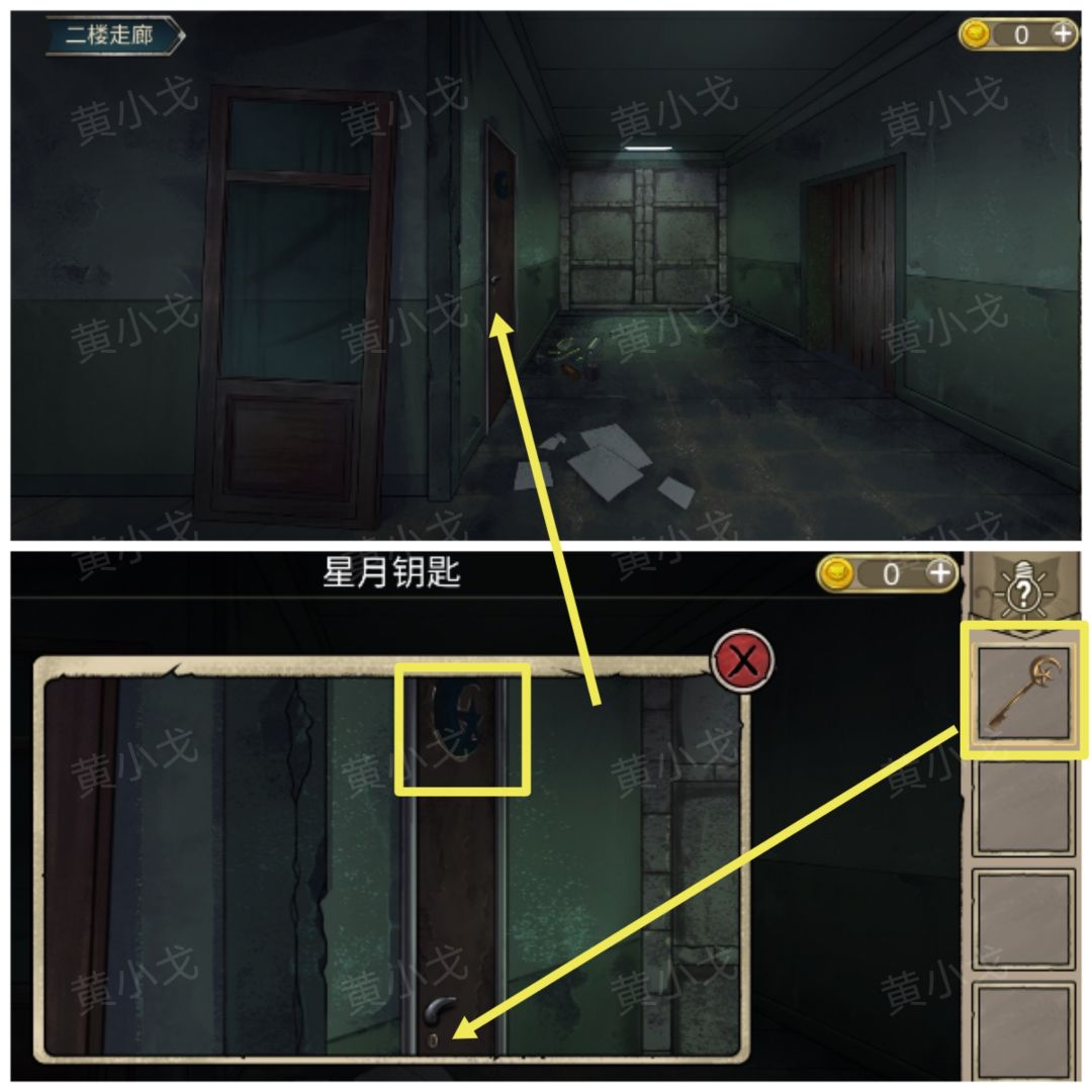 31.(二楼走廊)点击左边的门,根据上面的提示(星星月亮图案),用【星月钥匙】打开,进入实验室