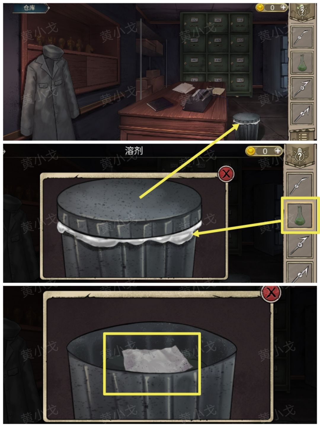 22.点击垃圾桶,用【溶剂】融掉上面的不明液体,打开垃圾桶,获得【打印纸】