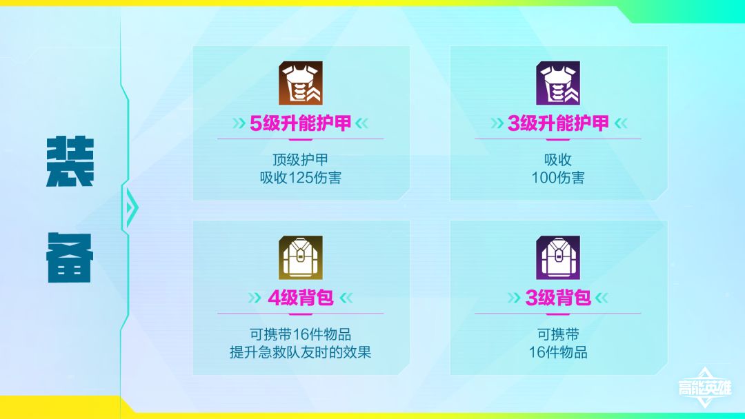 装备:其中「5级升能护甲」为支援仓专属物品(玩家无法从地面中得到,但可以通过积累伤害和升能得到)。