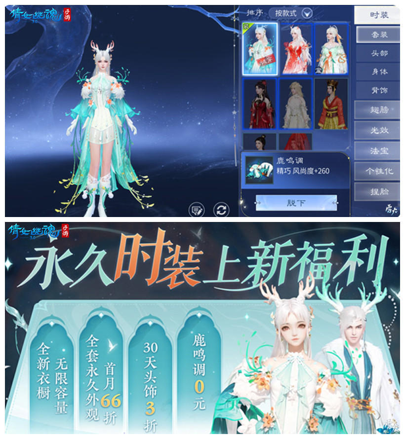 有了新时装,衣橱自然也要焕新,全新衣橱无限容量,搭配外观更加便捷随心。焕新首月,更有超值优惠:永久外观整套上新首月66折,所有商城头部时装(30天)3折,【鹿鸣调】还有机会0元购。