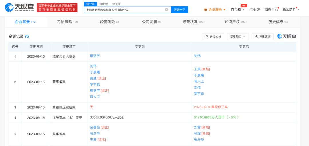 根据天眼查信息,9月15日,米哈游做出了法定代表人及董事名单变更: 法定代表人与董事长从“蔡浩宇”变更为“刘伟”(也就是常说的大伟哥);