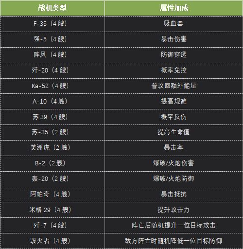 战舰搭配带来的属性也是非常多的,下面我们具体了解一下各类战机给战舰带来了哪些属性: