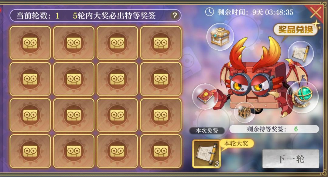 3、每轮大奖有概率刷出特等奖签,若连续5轮没有刷出特等奖签,则第6轮的大奖必出特等奖签。当大奖刷出特等奖签后,保底轮数重置;