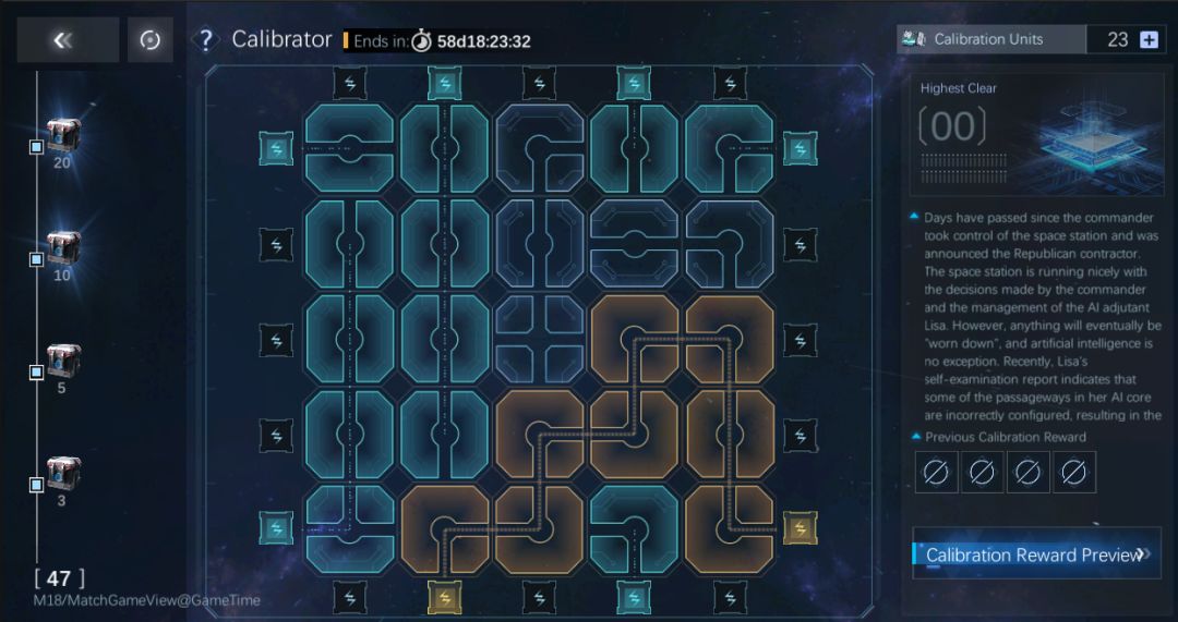 a) 链接通路,将Lisa调谐至完美状态:指挥官需要手动旋转屏幕上的基线单元,使基线单元的线路链接至屏幕边缘的线路结点