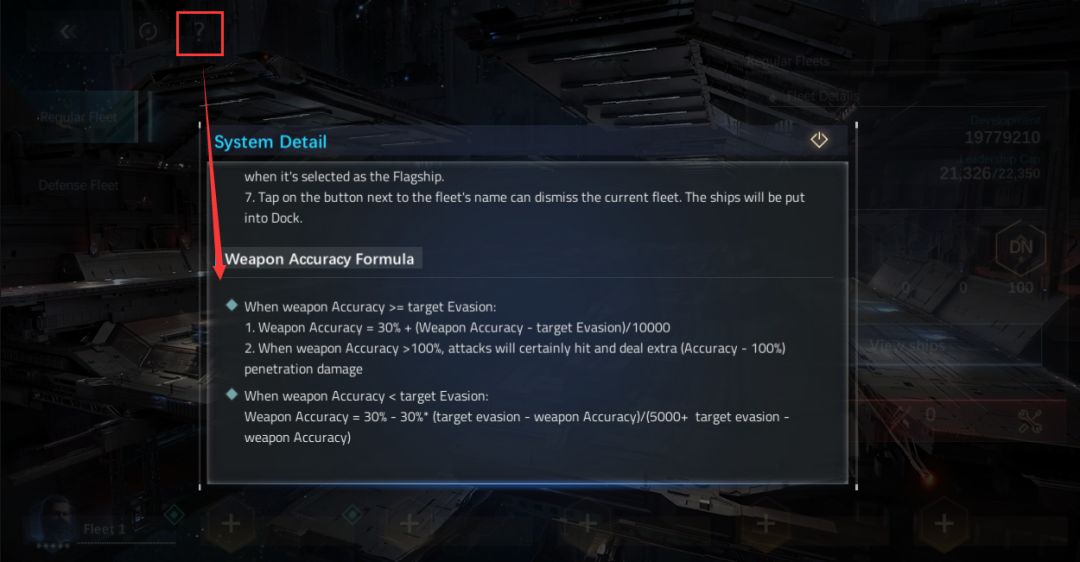 c) 闪避命中率公式,现在,在母港界面点击问号icon,可以查看闪避和命中率公式