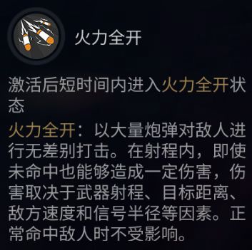 当激活火力全开(45级)后,能够在短时间内对敌人进行饱和式打击,即使在射程内未能命中目标,也能对其造成轻度伤害。这将对中小型高速目标产生一定的压制效果!