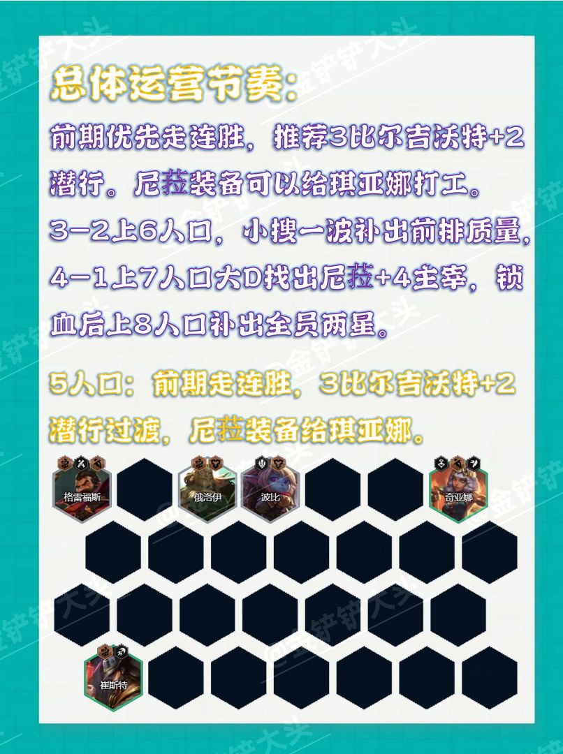 节奏:崔斯特开,开局海克斯拿潘多拉装备;2阶段保经济为主,3-5升七级大D质量,找一张尼菈后上八,开全质量。这里考虑到同行过多,因此尽量早抽卡,拖到4-1很容易尼菈被抢光。