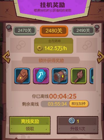 挂机的等级并不是一成不变的,它是可以通过爬关来进行升级,,玩家每过10关就可以获得一个升级的道具,玩家使用这个道具就可以升一级,同时每次升级之后的收益就会跟着有所提升。