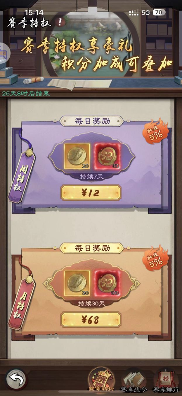 4.(1)赛季福利,周特权和月特权和S1一样,搁浅这里还是建议大家购买的,叠加使用可以比一般玩家多10%的赛季积分加成,争夺前十名快人一步。