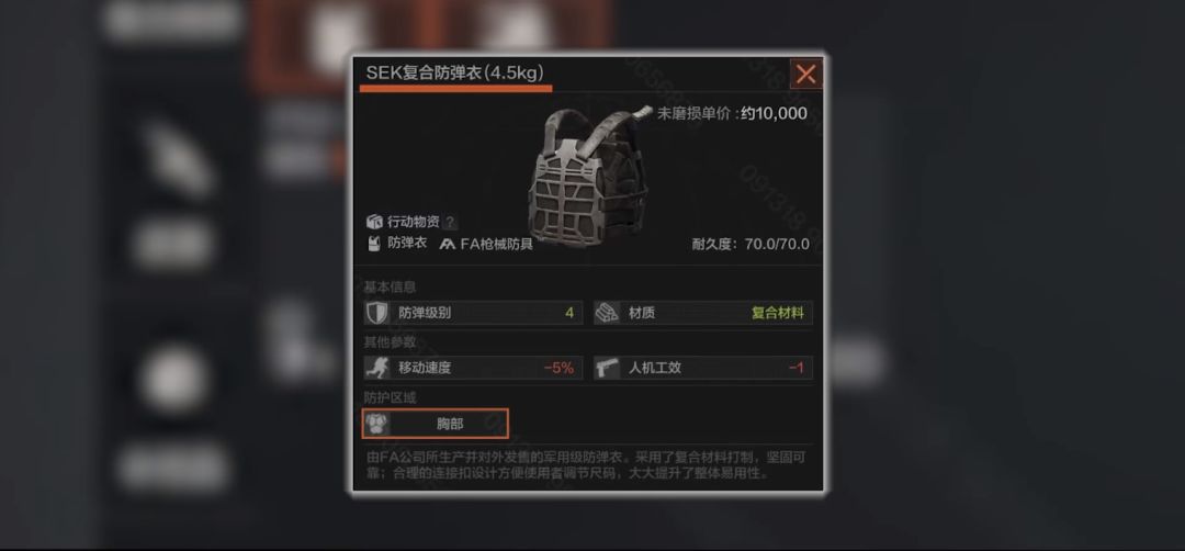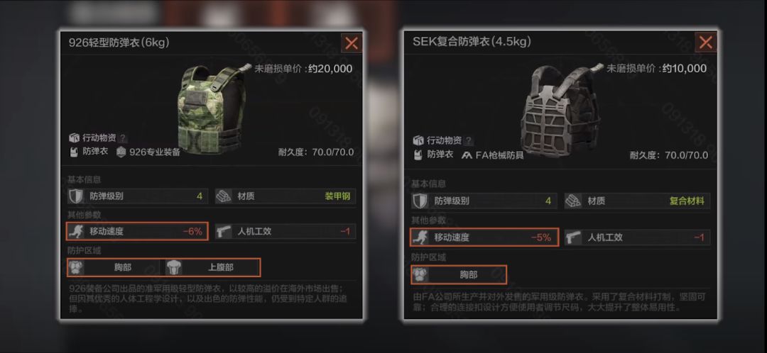 926轻型防弹衣,科伦提供的势力物资,可以护住胸部和上腹部,属性和SEK防弹衣差不多,多扣除1%的移动速度,同样有着70点耐久。