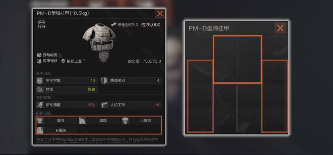 这次更新还新增了三件防具,防护等级均为4级。PM-D型弹挂甲,特维拉提供的势力物资,陶瓷材质,75点耐久,减少8%的移动速度和6点人机工效,但这是一件全防护甲,且有一个4格和两个3格的槽位,性价比非常不错,有望成为4级弹挂甲中的新贵。