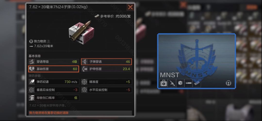 7.62x39毫米7N24子弹,特维拉提供的势力物资,穿透等级4级子弹穿透46,基础伤害60,护甲伤害23.4,精准度+5,垂直后坐控制-3,水平后坐控制-5,该子弹属性在4级弹中名列前茅,46的子弹穿透,60的基础伤害十分可观。