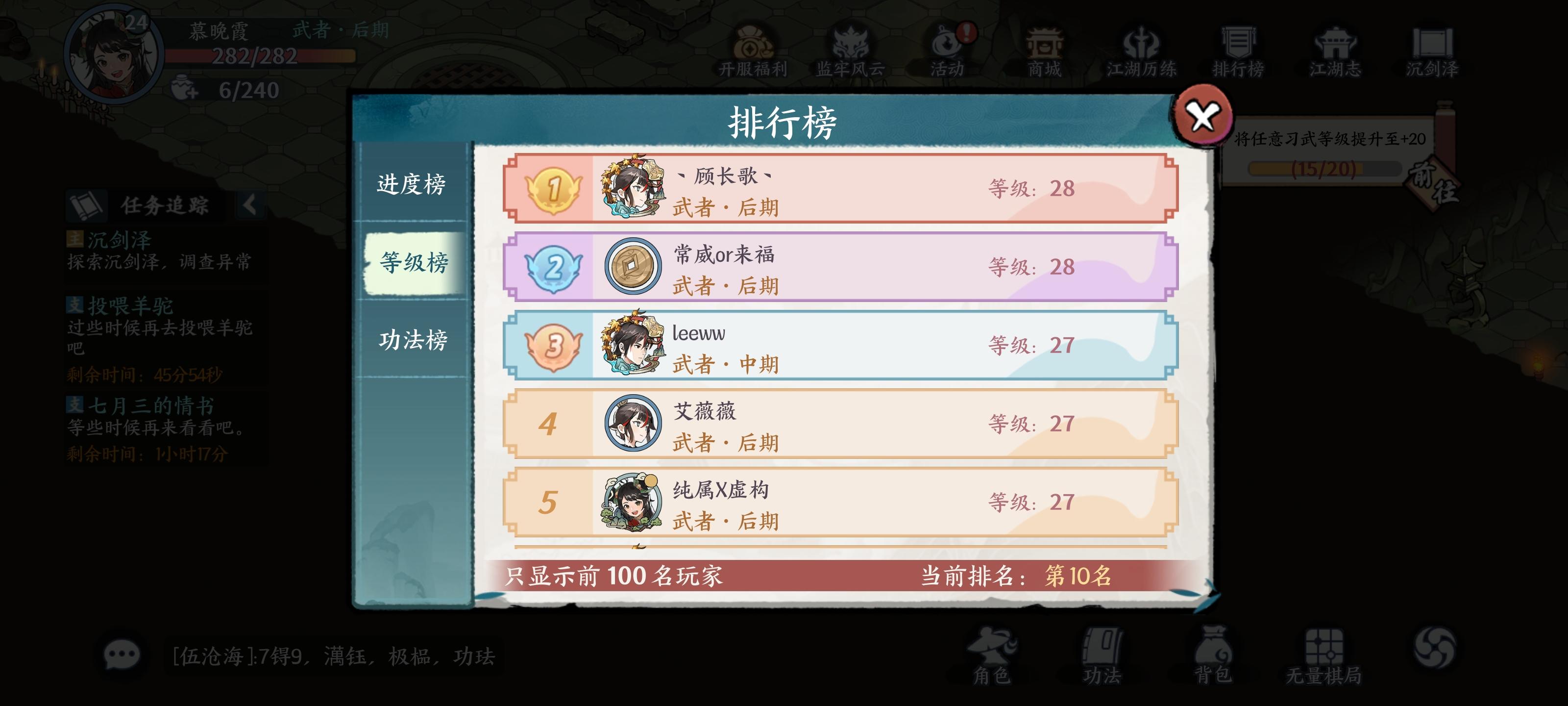 因为今天突然就入坑所以什么攻略都没做所以成了体力嘎嘎瞎整,看见排行榜等级高那么多我才反应不对劲来看攻略,结果就是成了这样一个救不回来的一个场面到不了燕子坞也到不了25级以上,我也不打算去新区,在这个区个人感觉抽的还好,今天开始打卡且行且看,看看我慕某人能在这个游戏玩多久!
