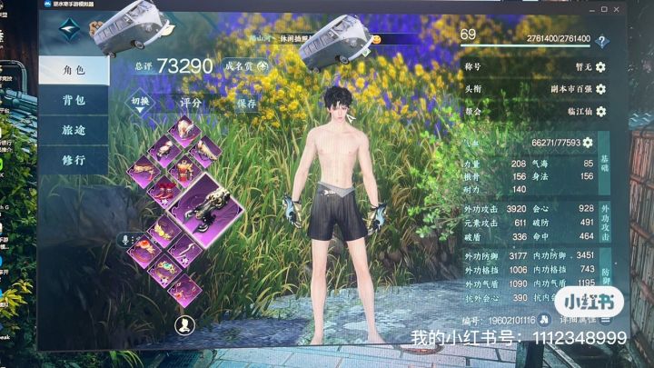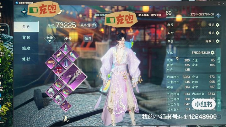 图一从开服认真经营的大号,活动一次没错过,副本一次没少打过,任务全清,偷师百家全满,探索都肝,全身五级宝石,内功三套无灵韵。
