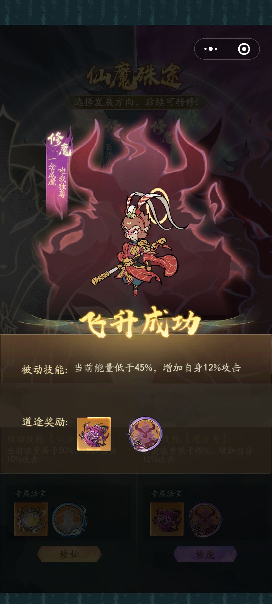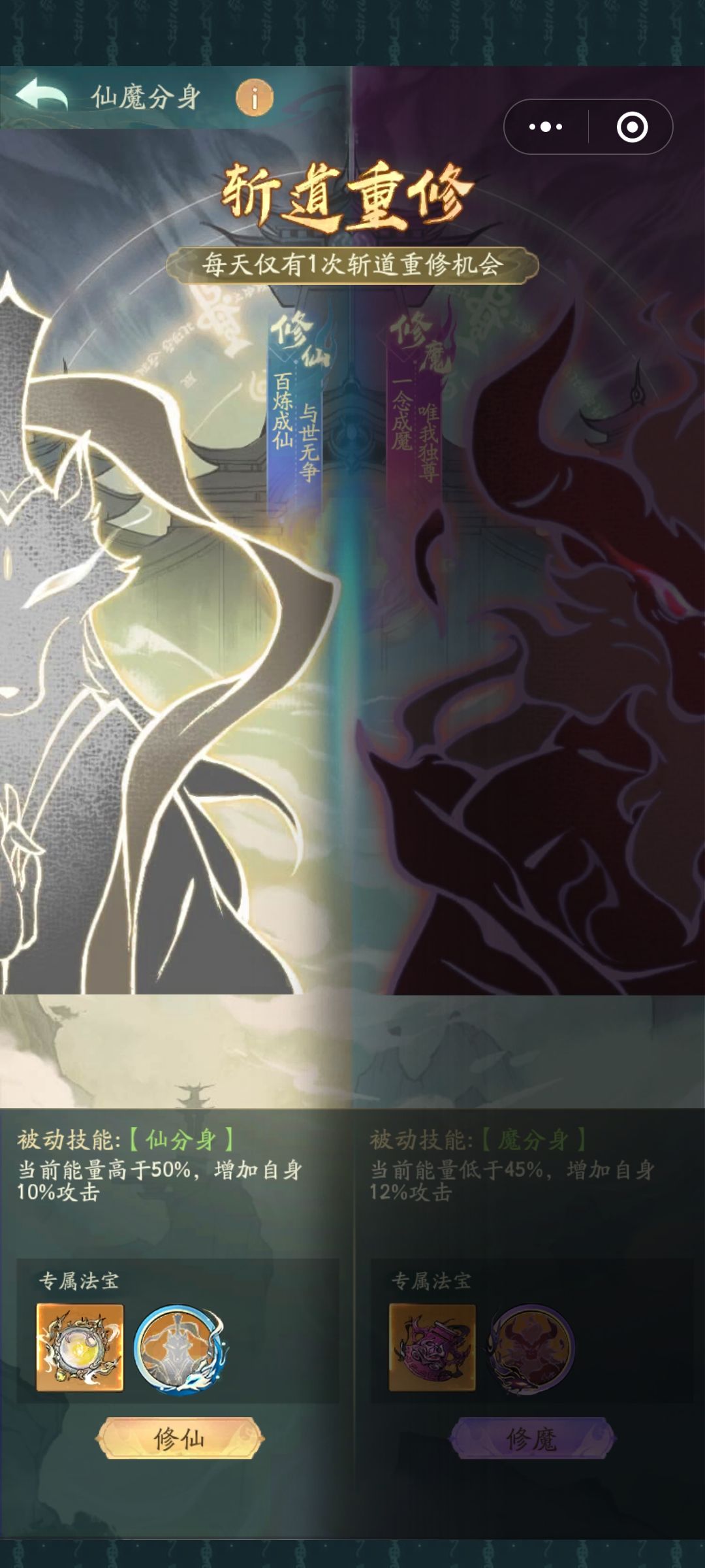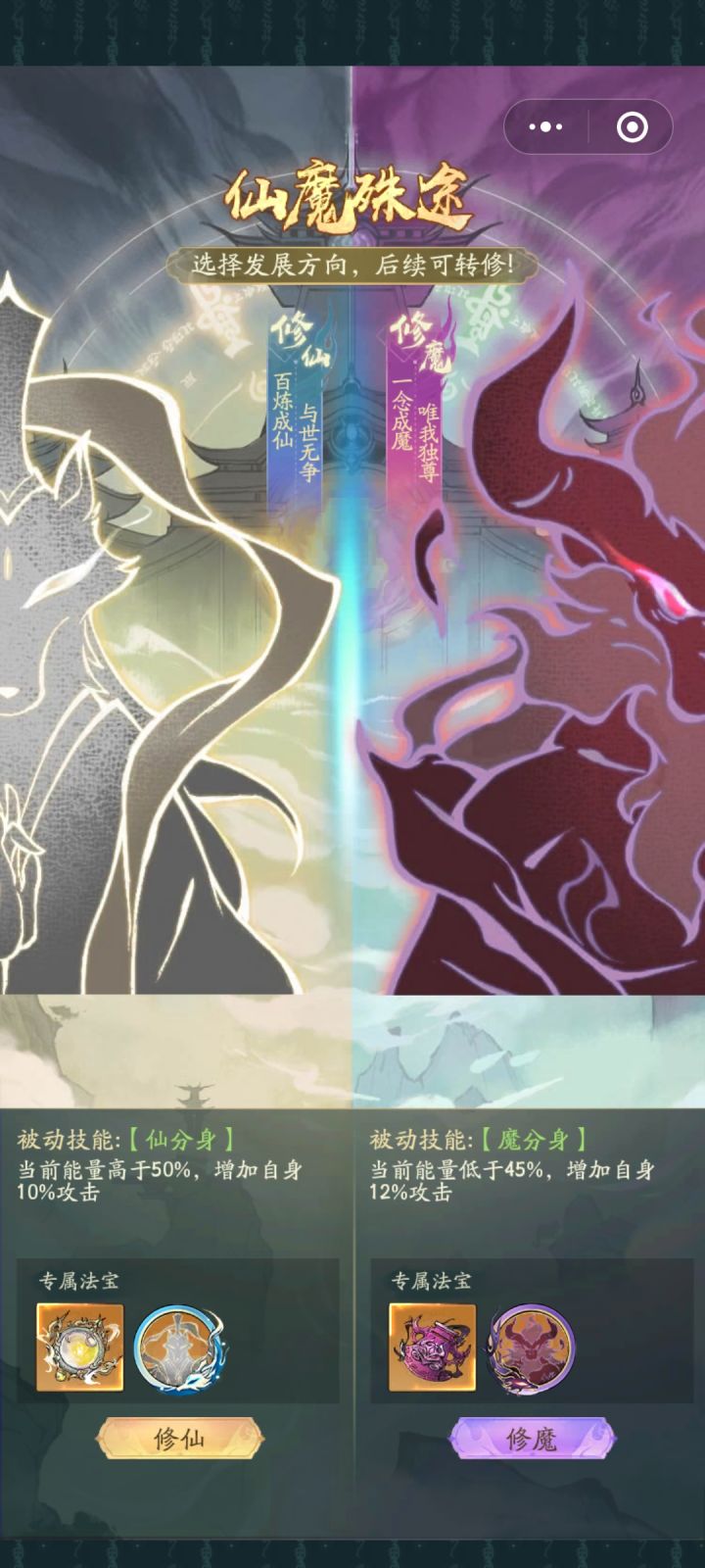 小程序版今天更新了,完成一定考验后,可以飞身仙界,获得仙魔分身,有专属的法宝可以获取。而且有选择焦虑症的也不用担心,可以转换的。