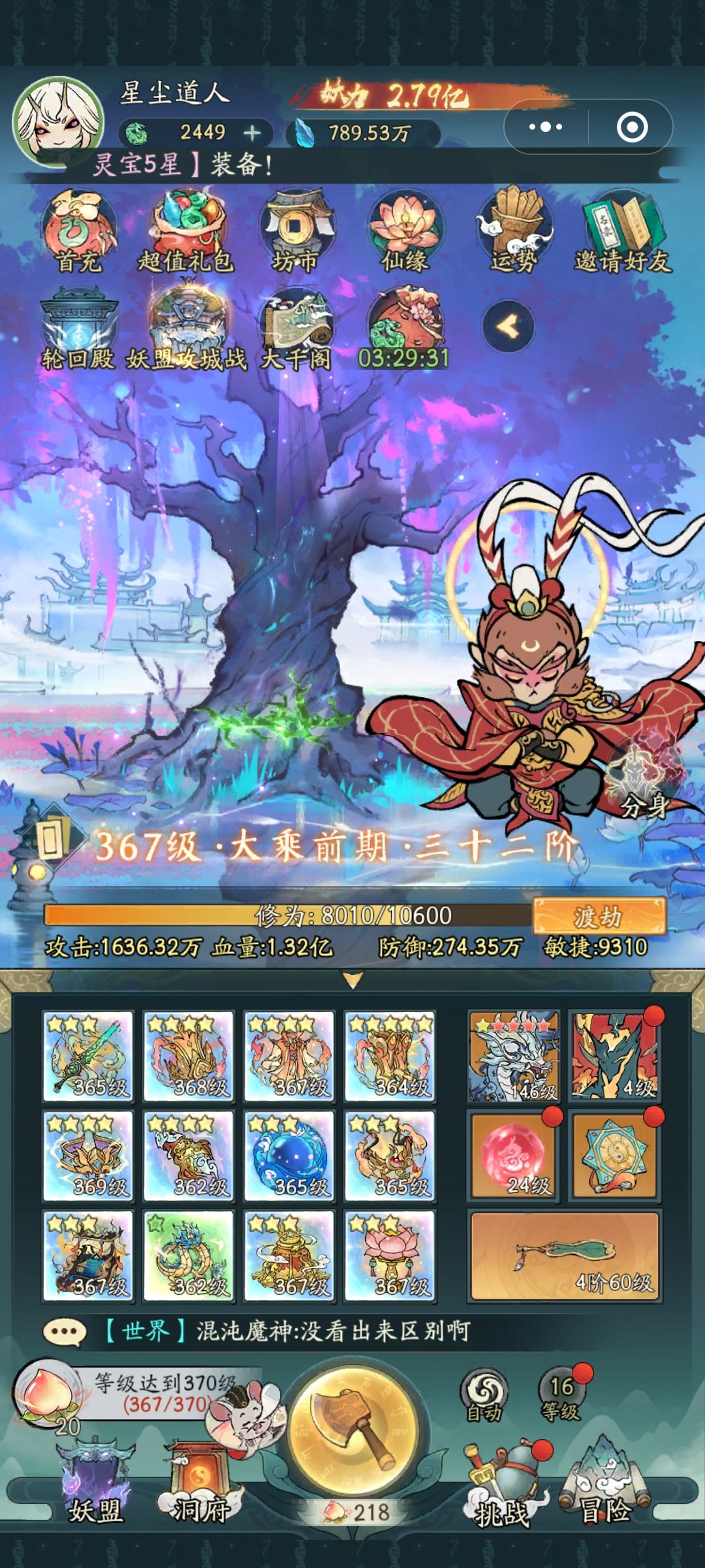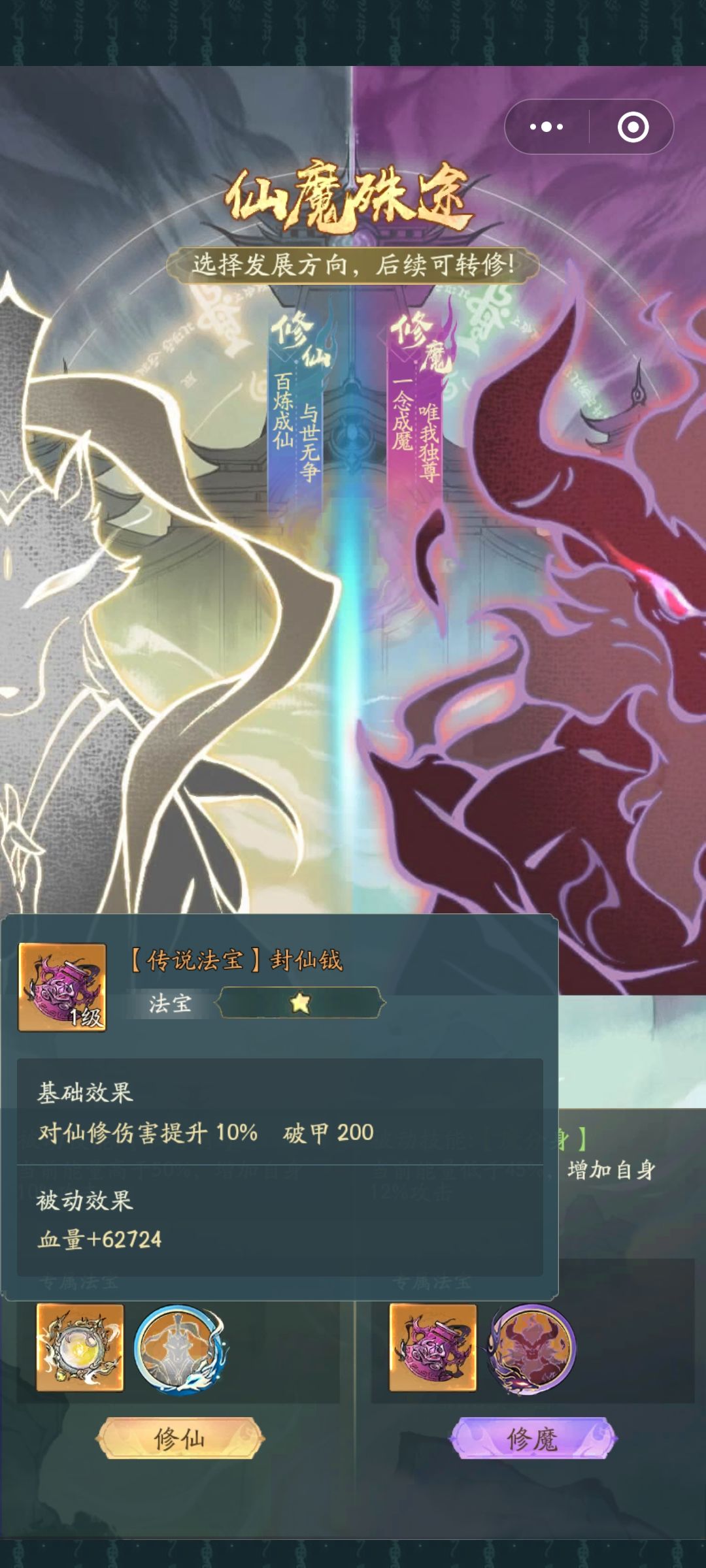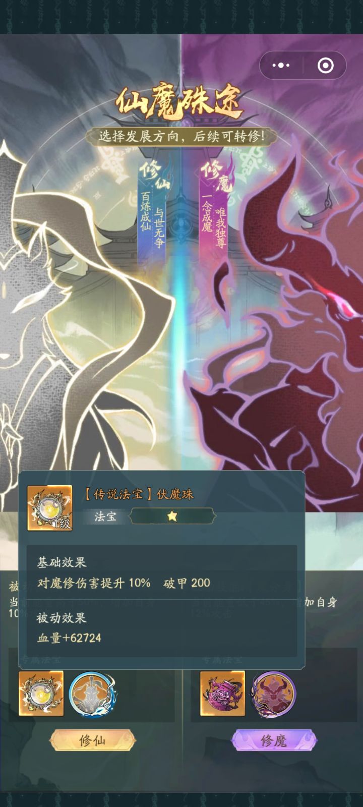小程序版今天更新了,完成一定考验后,可以飞身仙界,获得仙魔分身,有专属的法宝可以获取。而且有选择焦虑症的也不用担心,可以转换的。