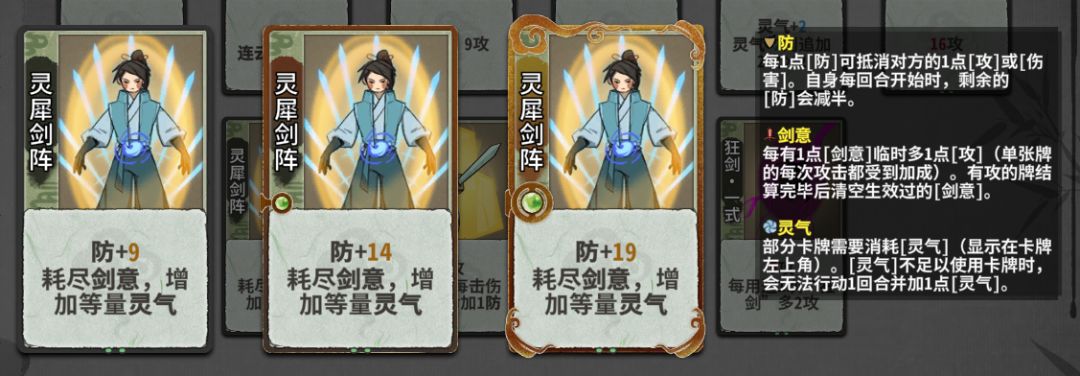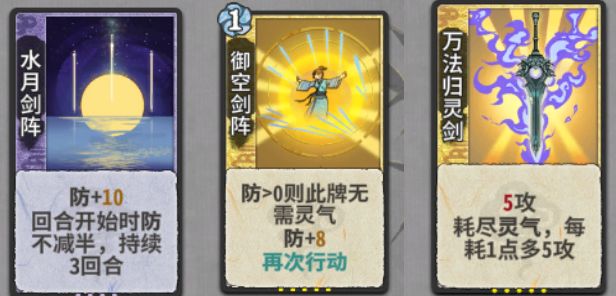 过渡最好用的灵气牌无疑是灵气灌注,这张卡1级能用,2级不错,满级4点灵气加一次穿防简直是绝绝子。4点灵气刚好可以打一套形意剑+地煞剑+巨鲸的组合技。要伤害有伤害,要防御防御。
