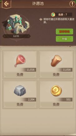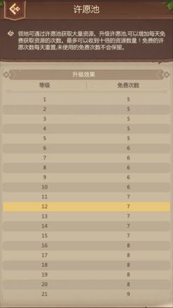 1、升级许愿池可增加每天免费次数,建议跟随大屋等级提升,提高每天免费次数,以获取更多资源。