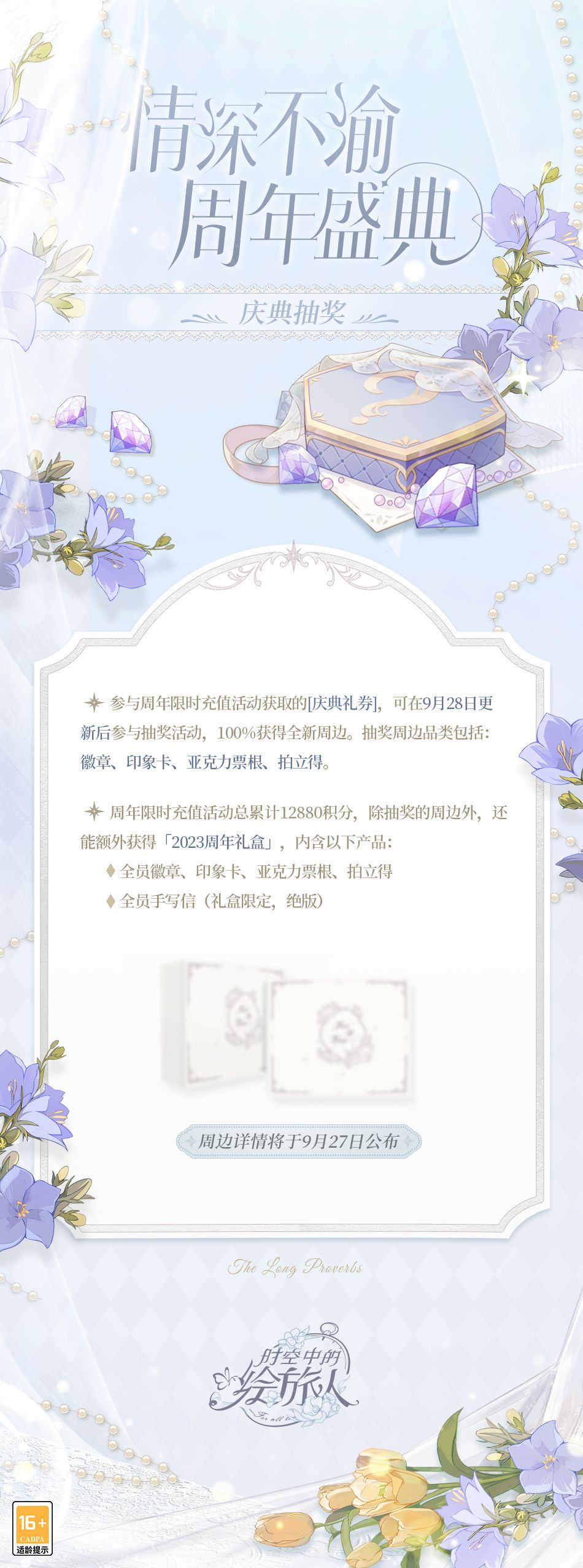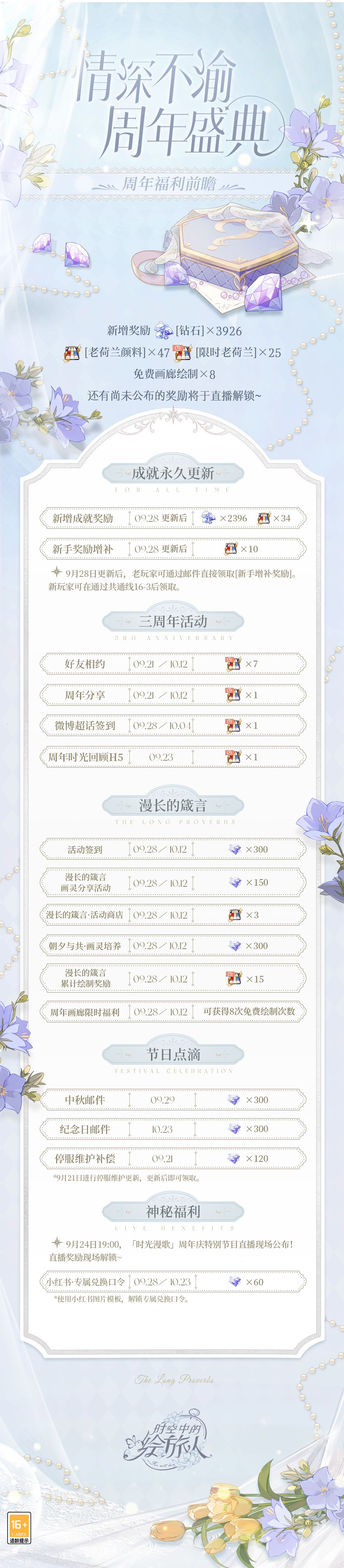 ★周年版本系列活动将陆续开放,活动「漫长的箴言」将于9月28日华丽开启。参与系列活动与任务,可获取[老荷兰颜料]*47、[限时老荷兰]*25、[钻石]*3926以及免费获得8次「漫长的箴言」画廊绘制机会。