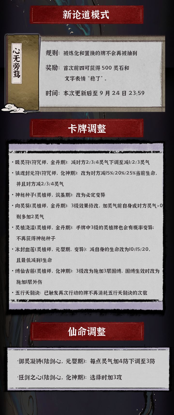 道友们好呀~我们会在今日15:00更新后带来新的论道模式“心无旁骛”,并进行平衡性调整。详情请见长图。