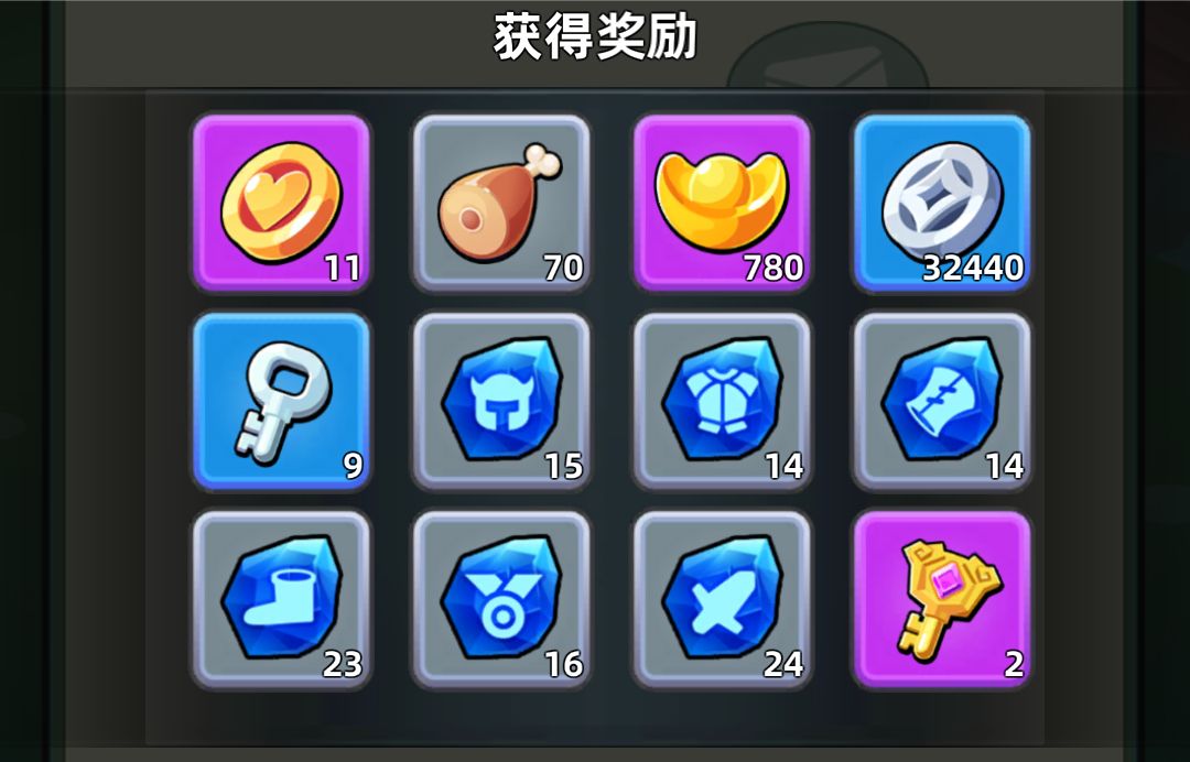 总计:34328银币、996元宝、9把普通钥匙、2把高级钥匙、106随机强化石、80体力