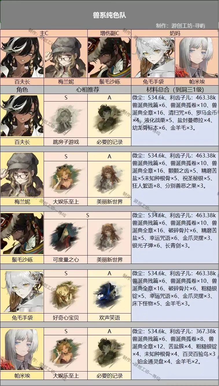 纯色兽体系队组成以百夫长/梅兰妮(主C),鬃毛沙砾(副C),兔毛手袋/帕米埃(奶妈;帕米埃输出会高于兔毛)注1:如果没有百夫长或梅兰妮,可以选择高塑玛丽莲作为主C注2:为了追求队伍伤害可以将兔毛手袋或帕米埃替换成牙仙,提高暴击率。