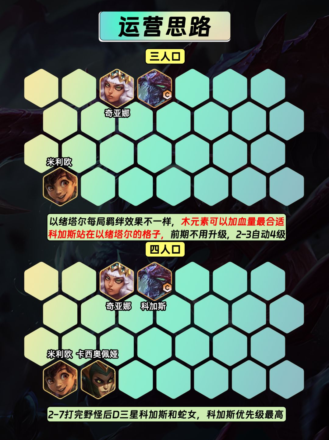 3⃣前期不升级,3人口上米利欧、奇亚娜和科加斯